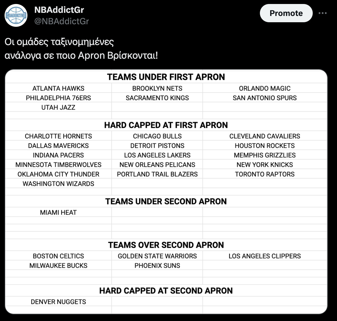 Οι ομάδες της Second Apron απ τη νέα σεζόν δεν μπορούν να αθροίζουν salaries για να γίνεται matching στα Trades! Πχ, αν οι Nuggets δίνουν 2 παίκτες των 15 Μ, δεν μπορούν να πάρουν έναν παίχτη με Salary 30M