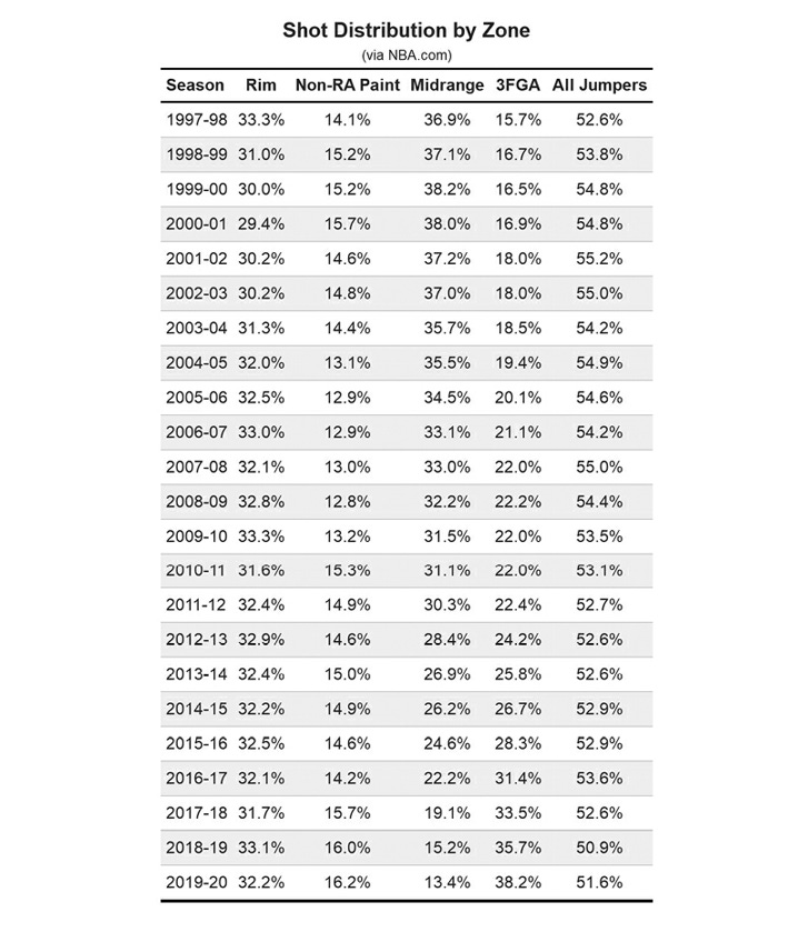 Πρώτα απ 'όλα, ο τίτλος, "The Midrange Theory" είναι ένας φόρος τιμής σε ένα από τα αγαπημένα μου hip hop άλμπουμ της νιότης μου, το "The Low End Theory" των A Tribe Called Quest. Όπως θα ήταν αναμενόμενο, o τίτλος του βιβλίου-κεφαλαίου αναφέρεται στην άνοδο των Τριπόντων και την ανάλογη μείωση των προσπαθειών μεσαίας απόστασης, περιγράφοντας και τα δύο με περισσότερες λεπτομέρειες αλλά και τι έχει συμβεί στην πραγματικότητα – δεν θέλω να κάνω Spoil το βιβλίο, αλλά υπάρχουν συγκεκριμένοι τύποι mid-range shoots που έχουν εξαφανιστεί ενώ άλλα έχουν αλλάξει ελάχιστα σε συχνότητα – καθώς επίσης την ενίσχυση του μεταβαλλόμενου ανταγωνιστικου πλαισίου όσον αφορά τις αλλαγές κανόνων, τις στρατηγικές προόδους και τη βελτίωση/διαφοροποίηση των δεξιοτήτων των παικτών που έχουν συμβάλει στις διαφορές μεταξύ του σημερινού παιχνιδιού και αυτού του παρελθόντος, περισσότερο από την εφαρμογή δεδομένων.