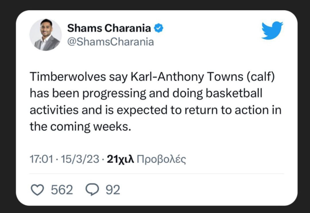 Ήταν τέλη Νοεμβρίου που είχε ανακοινωθεί ο τραυματισμός του Towns. Θεωρητικά θα ήταν εκτός για 3-4 εβδομάδες. Τελικά αυτό ήταν μία λάθος εκτίμηση διότι έχει φτάσει μέσα Μαρτίου κ ο KΑΤ δεν έχει φανεί ακόμη.